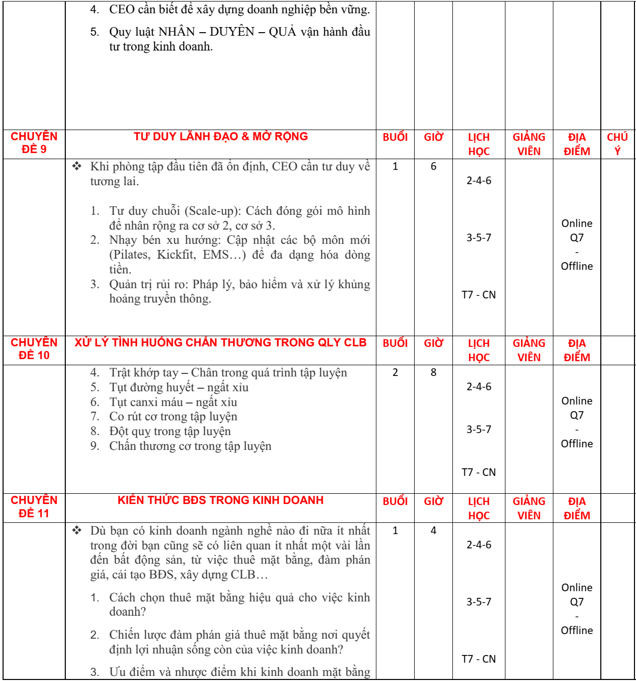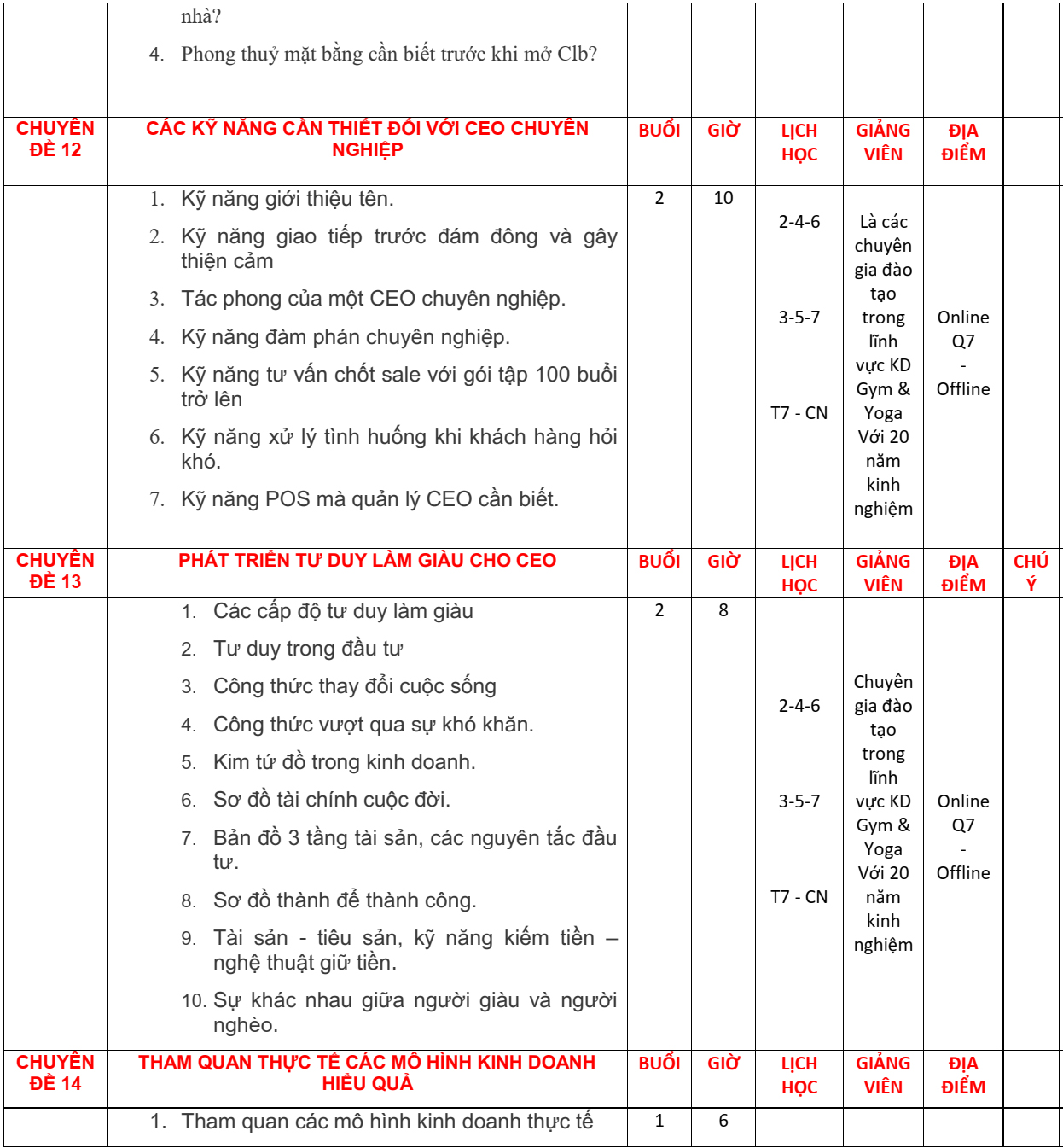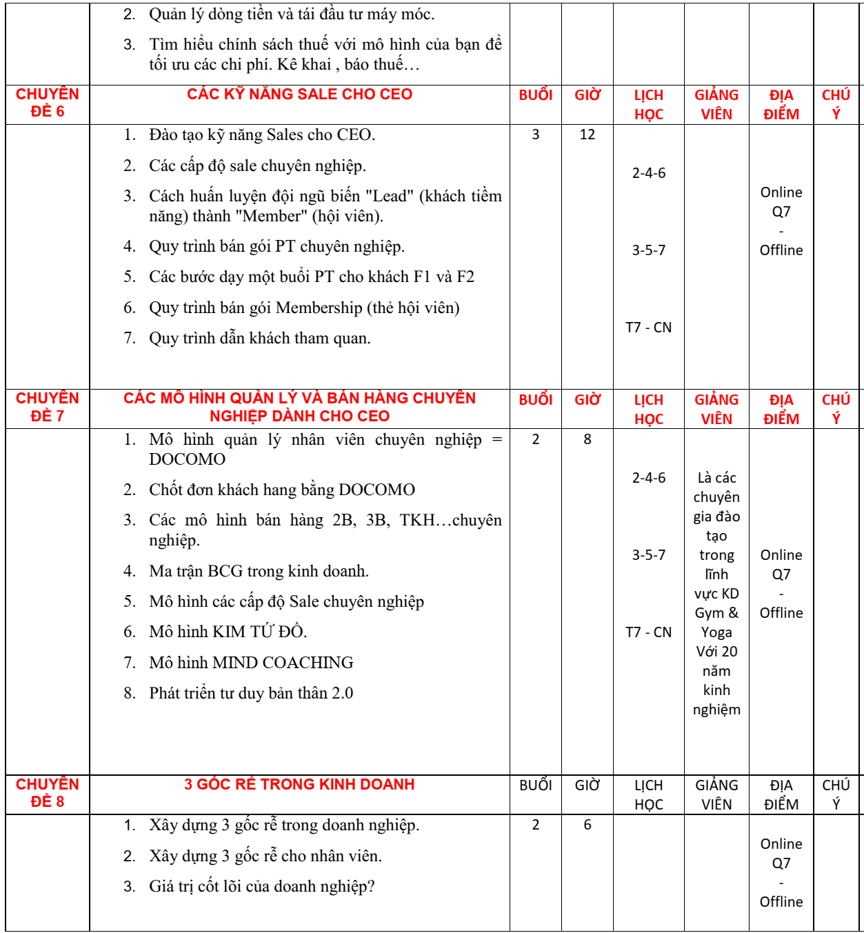 2. Nội dung đào tạo quản lý CEO GYM